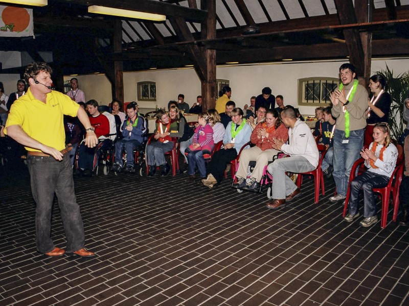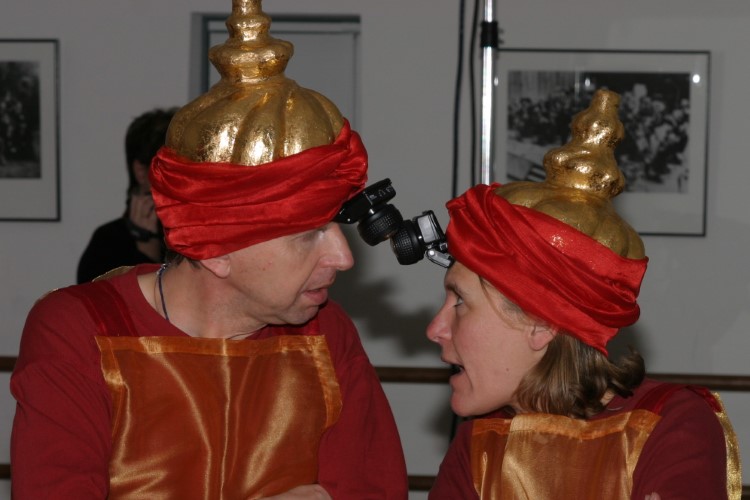 Na de lunch werd iedereen verzocht naar het plein voor het restaurant te gaan. Met veel kabaal kwam er een busje aangereden waar een aantal clowns, een goochelaar, een danseres en een circusdirecteur uit kwamen gerend. Ze begonnen met de voorstelling maar al snel bleek dat ze er helemaal niets van bakten. De circusdirecteur kwam op het lumineuze idee om de toeschouwers te vragen of zij wellicht zelf een kunstje konden doen, zodat er aan het eind van de dag een goede voorstelling kon worden vertoond, want met hun circusartiesten zou het niet veel soeps worden.